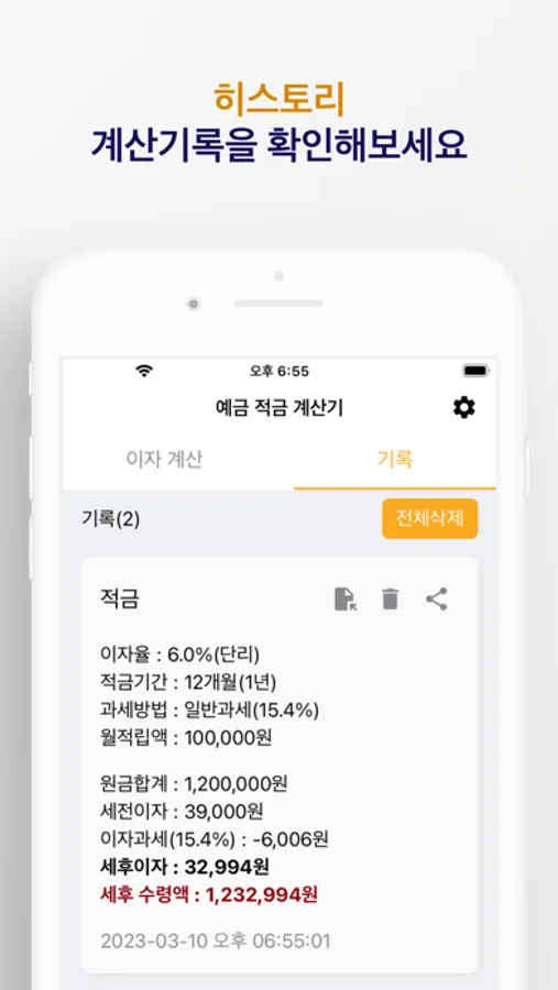 - 세전이자, 세후이자, 이자과세, 세후 수령액을 확인할 수 있습니다.