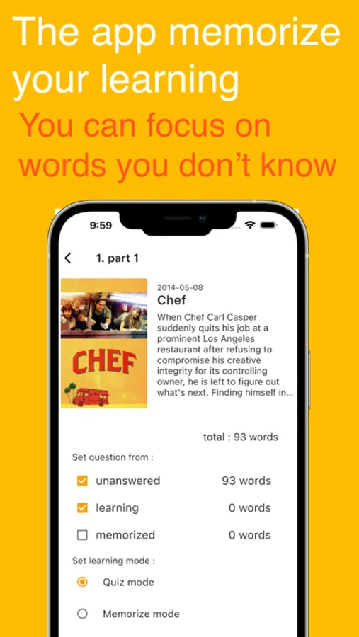 Using your favorite movies and foreign dramas to learn a language is a great method, but it can be difficult to connect it to learning since many unfamiliar words appear at the native speakers' speed. If you have to pause the video and look up words in a dictionary every time you come across an unfamiliar part, you can't enjoy the work. Adding Japanese subtitles also significantly reduces the effectiveness of English learning. This app allows you to learn the English words that appear in the work in advance without giving away spoilers, so you can concentrate on enjoying the English and the work when you watch it. Additionally, reviewing the material after watching can efficiently increase your known English vocabulary.