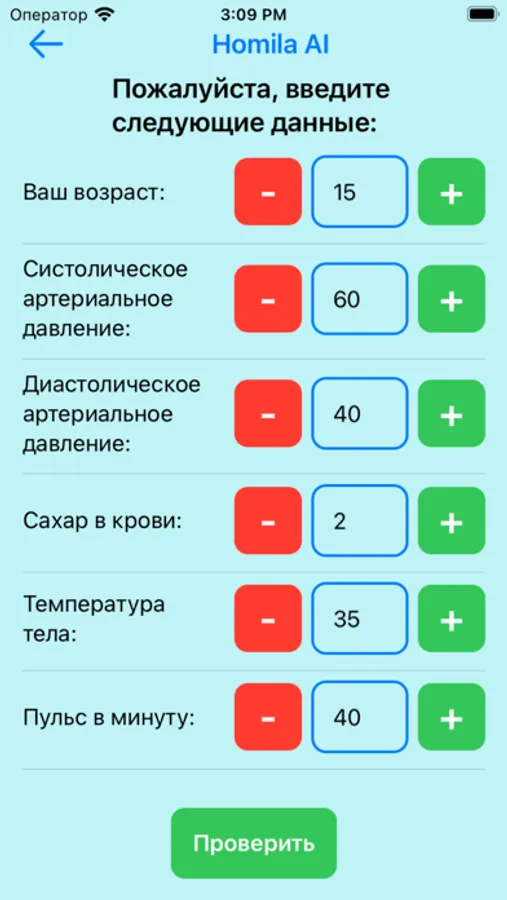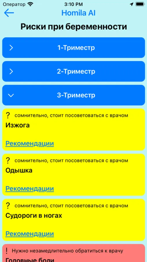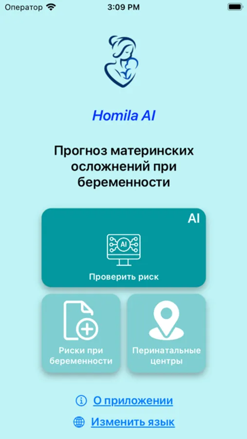 Приложение Homila AI позволяет определять с помощью алгоритма машинного обучения прогноз развития материнских осложнений при беременности. Используется метод Случайный Лес - 90% точности. Приложение на основе ввода 6 параметров прогнозирует низкий, средний или высокий риск развития материнских осложнений при беременности.