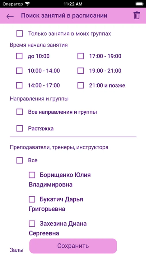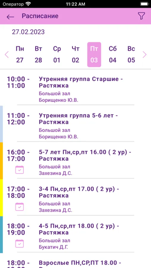 - бронировать места на занятиях;