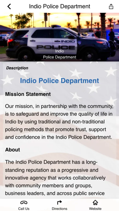 On behalf of the Indio Police Department, welcome to our app. This app is for the employees and family members of the Indio Police Department as well as the community it serves. It contains information about our department as well as safety and crime prevention tips. Indio Police Department employees will have access to a full range of wellness tools.
