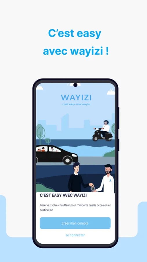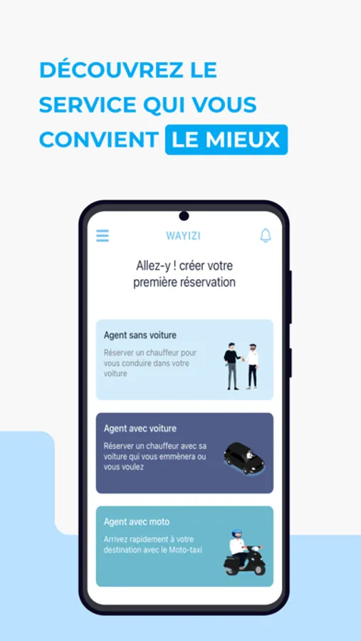 conduire dans votre voiture à votre destination grâce à un chauffeur WAYIZI. et Même un service moto taxi a été inclus pour une meilleure mobilité.
