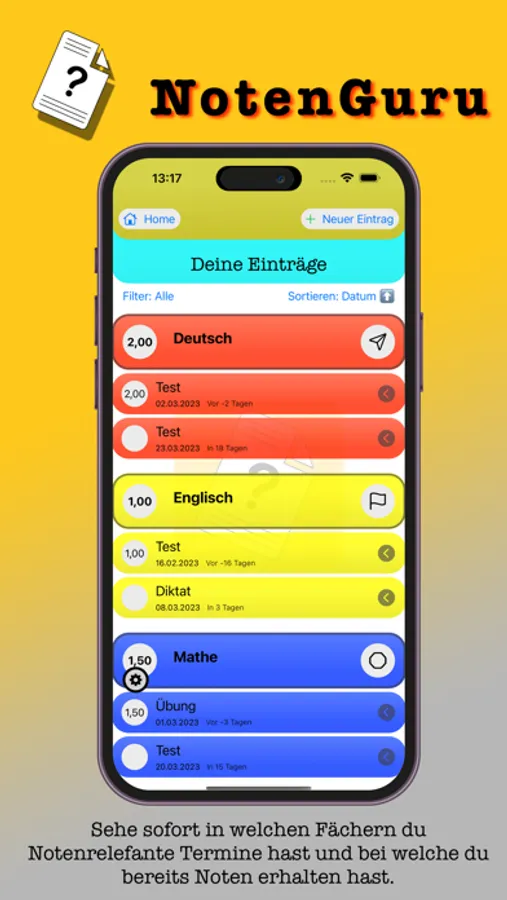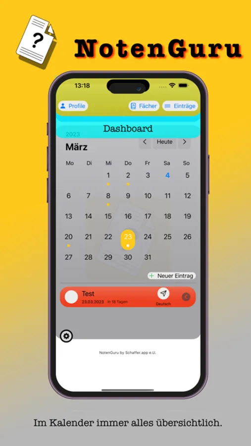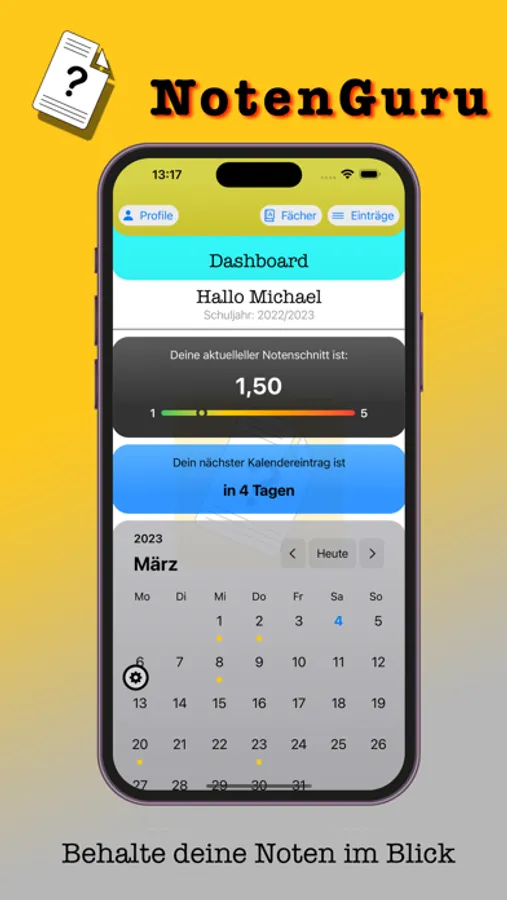 Mit NotenGuru behältst du stets den perfekten Überblick über deine Leistungen in allen Fächern. Speichere wichtige Termine für Tests und notenrelevante Ereignisse in deinem persönlichen Dashboard. Behalte so jederzeit den Überblick, um bestmöglich vorbereitet zu sein. Sobald du deine Note erhalten hast, trage sie einfach in NotenGuru ein und du siehst sofort, wie sich diese auf deinen Notenschnitt auswirkt. Auf diese Weise behältst du deine Zeugnisnote immer im Blick.