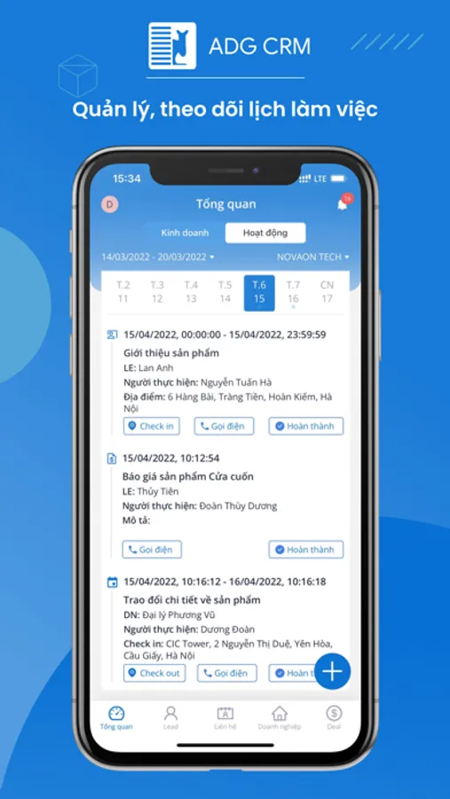 Với việc tích hợp Google API, hệ thống cho phép người dùng thiết lập địa điểm cho cuộc hẹn, thực hiện thao tác check-in/ checkk-out tại địa điểm đó. Thông qua thời gian check-in và check-out, hệ thống đem đến cái nhìn tổng quát về thời gian tiếp xúc khách hàng và tổng số cuộc hẹn hoàn thành của từng nhân viên.