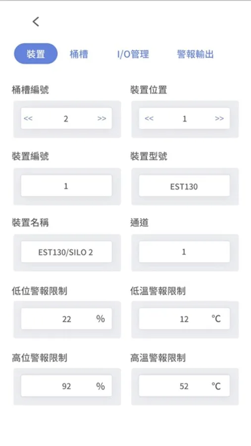 管理者可以觀看各個桶槽資訊,包含以下:桶槽編號、裝置型號、桶槽名稱、桶槽高位、桶槽低位、物料高度、物料剩餘比例、物料體積、物料重量及狀態警示等。