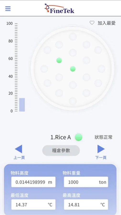 管理者經由 APP 掌握物料桶槽資訊 倉溫線 (多點位儲倉溫度感測線) 二合一倉溫料位計等正常工作與否,或發現異常可即時緊急安排處理,大大降低管理成本,及減少不必要的損失.