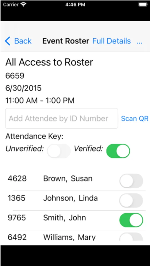 Adding an attendee to an event roster is as simple as scanning the QR code on the membership card, or entering the MOPD ID manually.