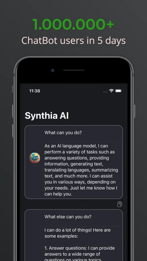 When you open the app, you can start talking to Synthia right away. You can ask questions, chat, or share things with it. ChattyGPT is working to provide you with quick and accurate responses and is getting better each time.