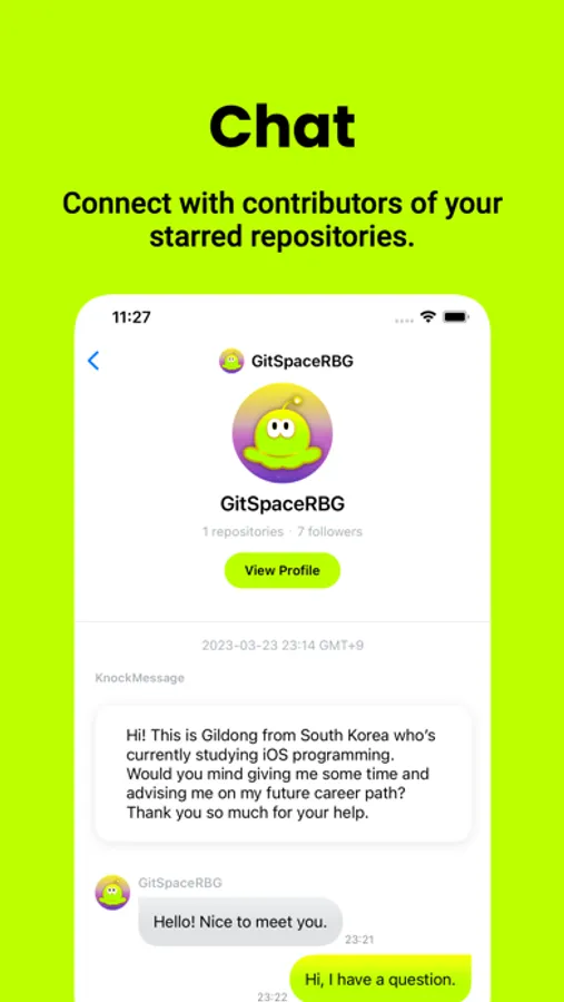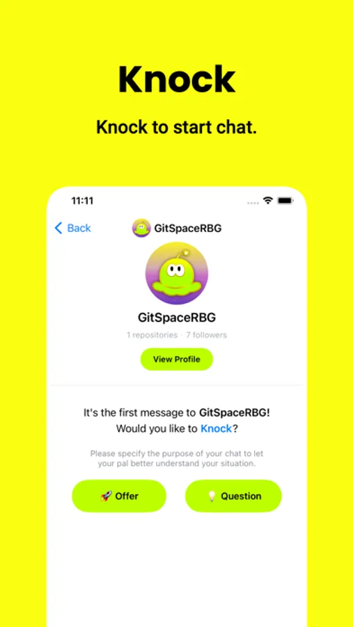 - You can start a chat by sending Knock message to GitHub users you follow or to contributors of your starred repositories.