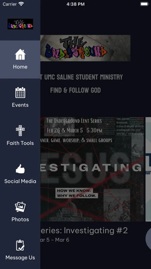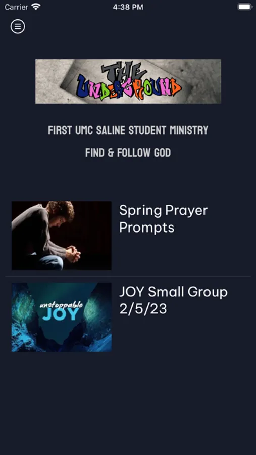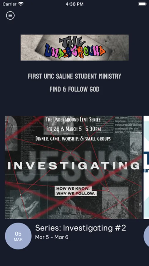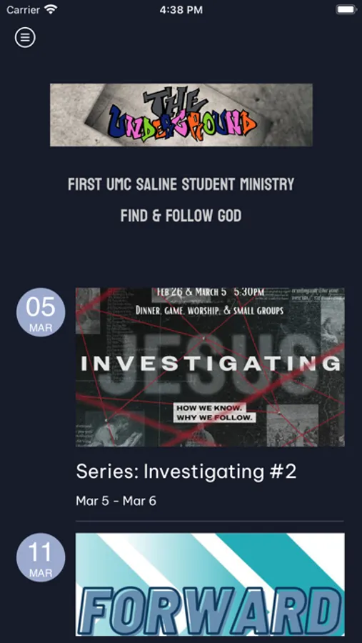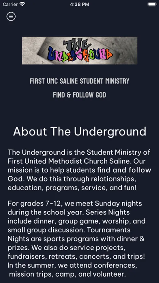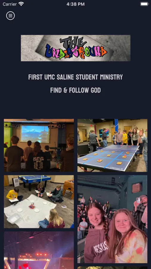 Stay connected to The Underground Student Ministry at First UMC Saline! Calendar of events for weekly gatherings, registration links for special occasions, faith resources and tools to mature spiritually, small group discussion guides for leaders, photos from our gatherings, links to social media, & more!