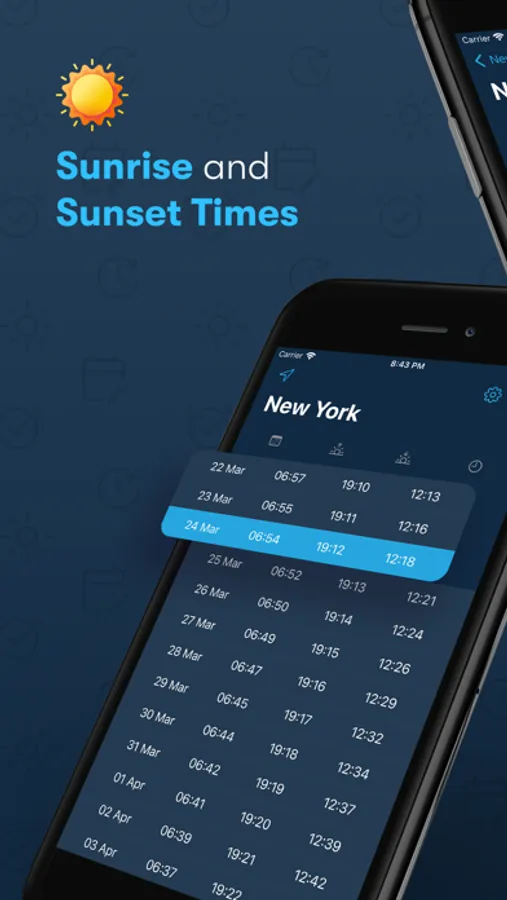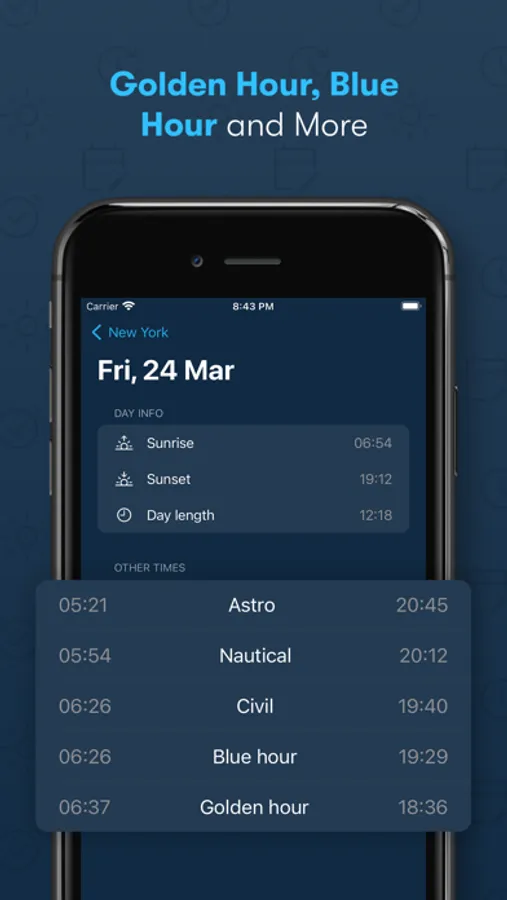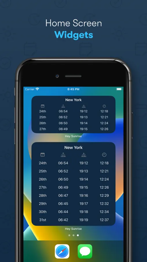 - Home Screen Widgets: Instantly access sunrise and sunset times right from your home screen with our collection of customizable home screen widgets! Customize each widget to display sunrise and sunset times for any location, adding a touch of elegance to your device. Our selection of widgets includes information like sunrise time, sunset time, day length, day length change, solar noon time, first light, and last light.