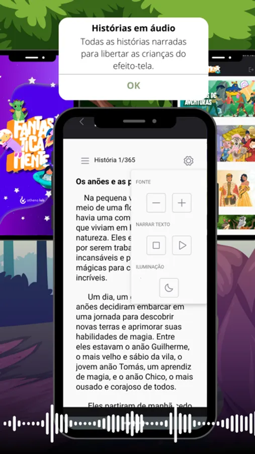 Nosso conteúdo é em texto e áudio para deixar as crianças livres de telas. Isso traz vários benefícios como: