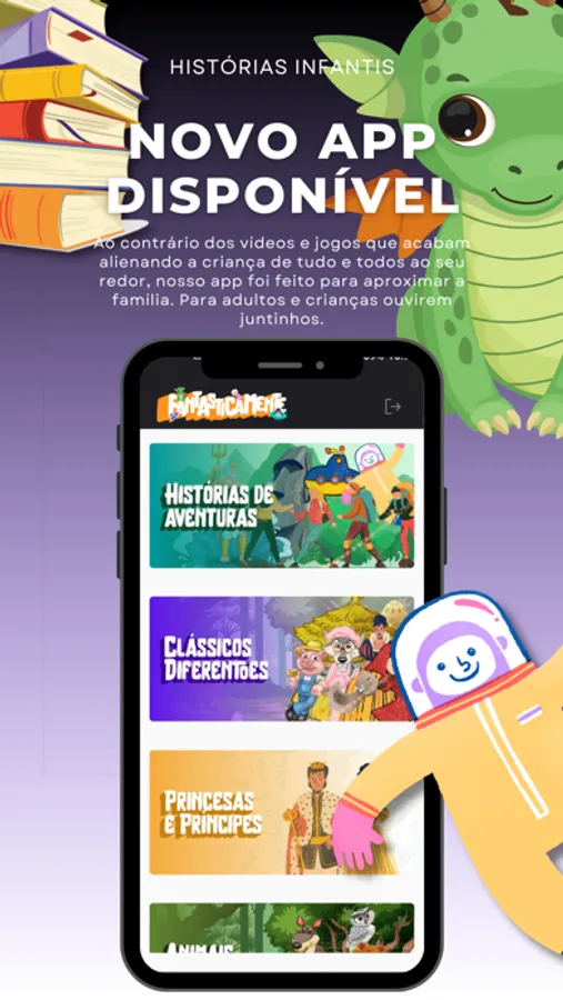 O FantásticaMente é um app de histórias infantis para crianças. A produção textual é rica em detalhes para estimular a imaginação dos pequenos e conectá-lo com você, mãe ou pai dos pequeninos. O conteúdo é totalmente adequado para crianças de 2 a 7 anos.