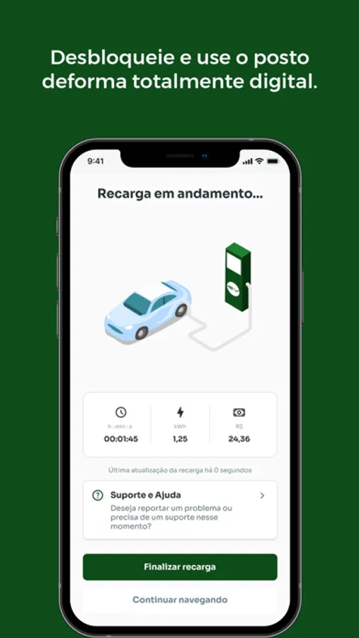 Otimize seu tempo: encontre um eletroposto, saiba seu estado de uso, desbloqueie o eletroposto e tenha controle sobre o andamento da sua recarga, tudo isto em tempo real e pelo aplicativo!