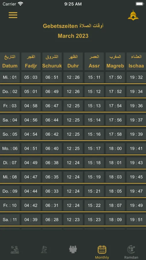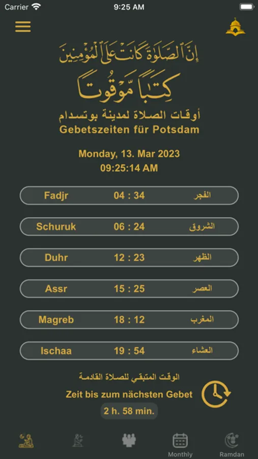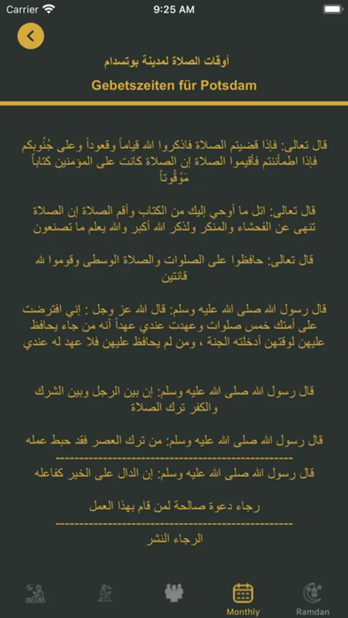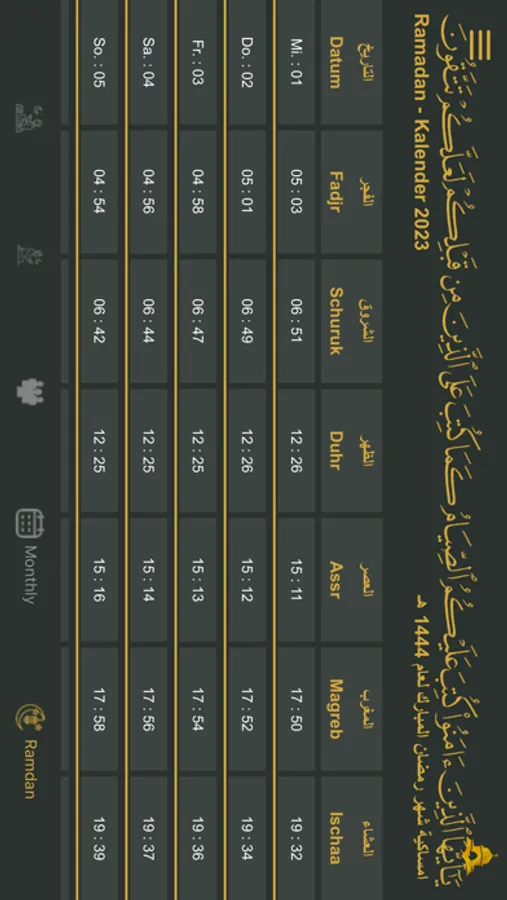 - Zeigt die Zeiten der fünf täglichen Gebete an.