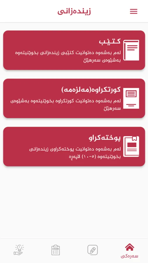 لەوانە کتێبی وانە ، کتێبی ڕێبەر ، کورتکراوە(مەلزەمە) ، پوختەکراو
