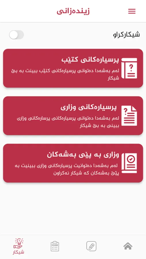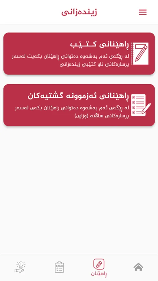 وەهەروەها بەشێکی ناوەزەشمان بۆ ئامادەکردوون بە ناوەی بەشی پرسارەکان بە پێیی بەشەکانی کتێب کە بەم زوانە بەردەست دەبێت.