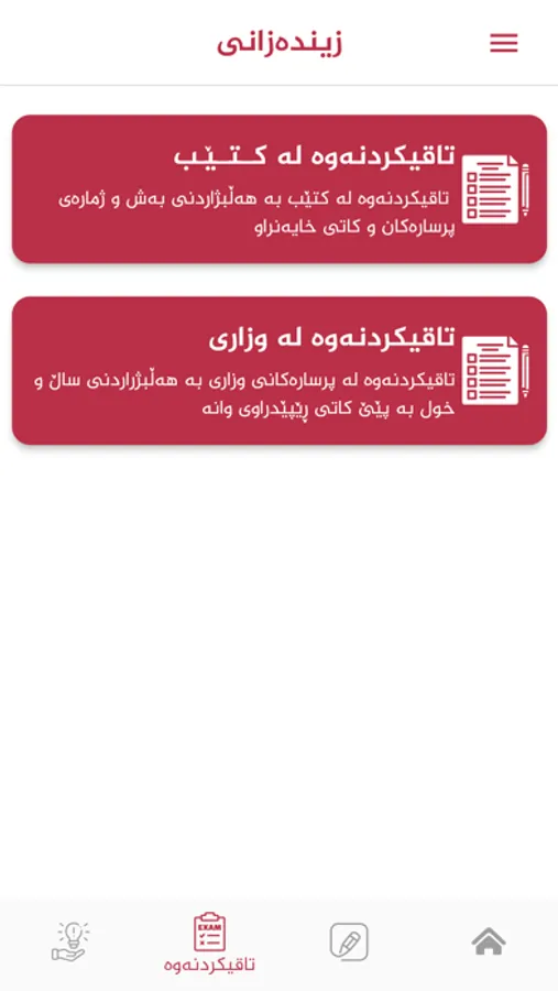 بەشی تاقیکردنەوە : ئەم بەشە تایبەتە بە ئەنجامدانی تاقیکردنەوە لەسەر پرسیارە گرنگەکانی ناو کتێب بە هەڵبژرادنی بەش و ژمارەی ئەو پرسیارەکان و کاتی تاقیکردنەوە، هەروەها تاقیکردنەوە لە پرسیارەکانی وزاری بە شێوەی هەڵبژراردنی ساڵ و خول (خولی یەکەم، خولی دووەم، بەرایی) وە کاتی تاقیکردنەوەی ئەزموونە گشتەکانمان لە وانەکە داناوە بۆ مۆدی تاقیکردنەوەی پرسیارەکانی وزاری بۆ ئەوەی قوتابیان و خوێندکاران وا هەست بکەن و ئەزموون بکەن کە لە تاقیکردنەوەی ئەزموونە گشتیەکاندان.