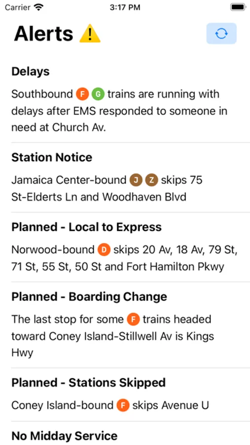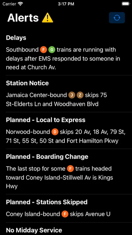 Open the app, and you'll see a list of subway departures organized by time and distance to you. Swipe left to see active service alerts, and click on an alert to get more detailed information. That's... it! A stripped-down approach means virtually instant load times, no ads or bloat, and a one-click answer to the two most common commuter questions.
