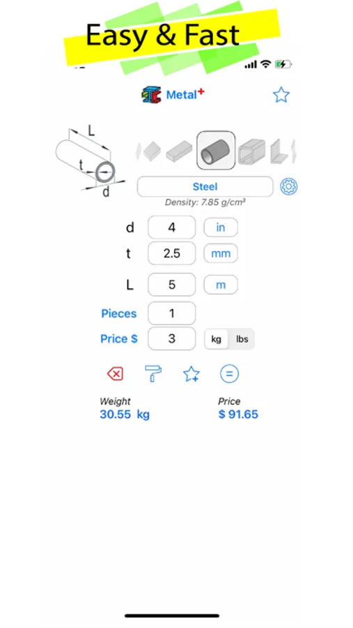 Metal+ can calculate the weight of any metal form, such as round, sheet, tube, rectangle, and much more.