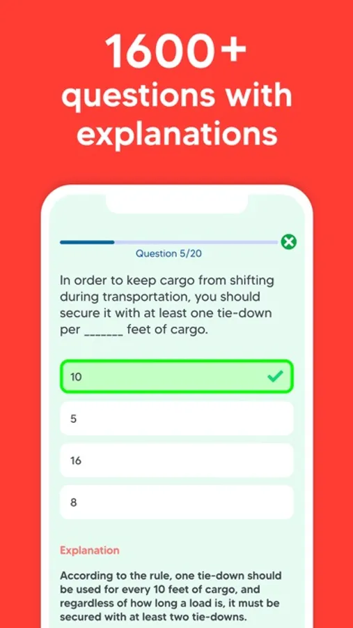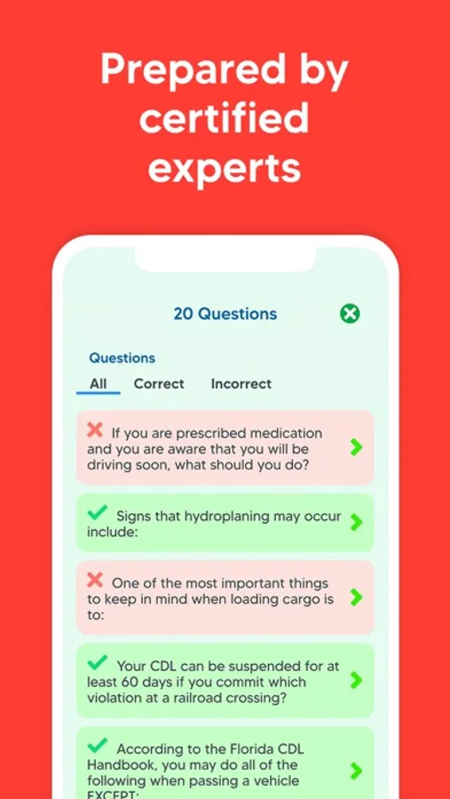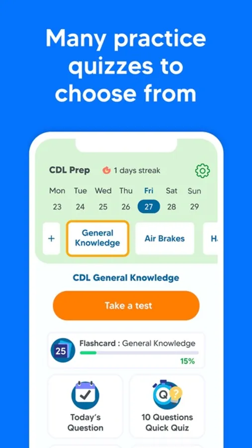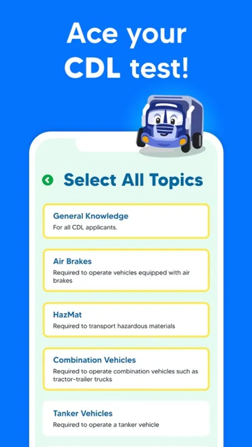 Our app features over 1,600 expertly-crafted practice questions that closely simulate the actual CDL exam. Covering all essential sections - General Knowledge, Air Brakes, Combination Vehicles, Hazardous Materials, Passenger Vehicles, and more - our practice tests ensure you’re well-equipped to pass the exam.