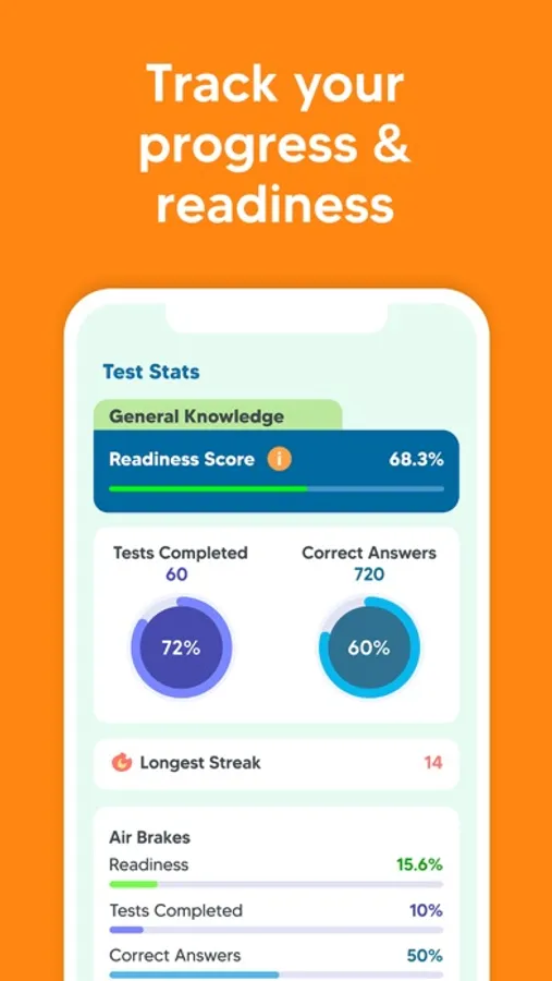 Our app offers a personalized study plan tailored to your skill level, study frequency, and target test date. Unsure when you'll take the exam? Adjust your study plan anytime. Our proprietary readiness score helps you determine when you're prepared to ace the real exam on your first try.