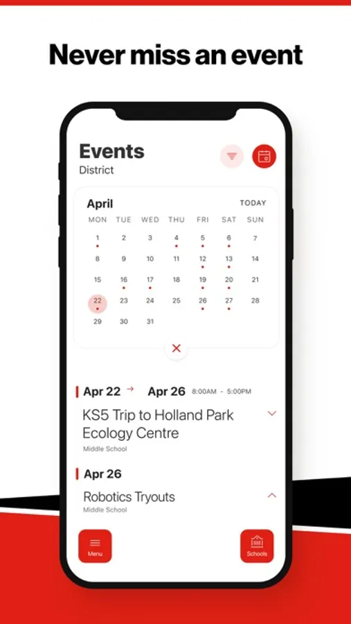 The event section shows a list of events throughout the district. Users can add an event to their calendar to share the event with friends and family with one tap.