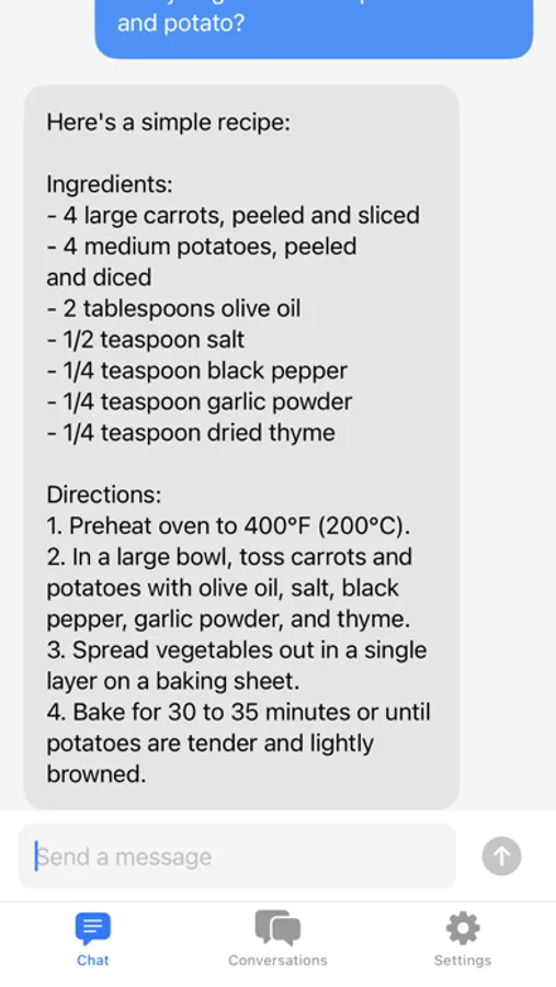 GeePeeTee is a simple native app that lets you quickly access the advanced chatbot API. Fill in your secret API key and you're ready to go! You can also start multiple conversations with different prompts and easily access them from the Conversations page.