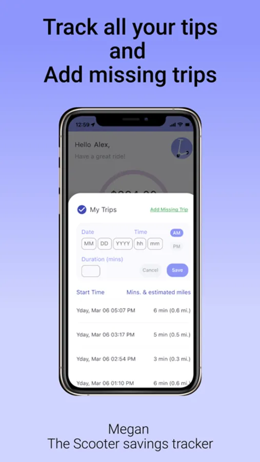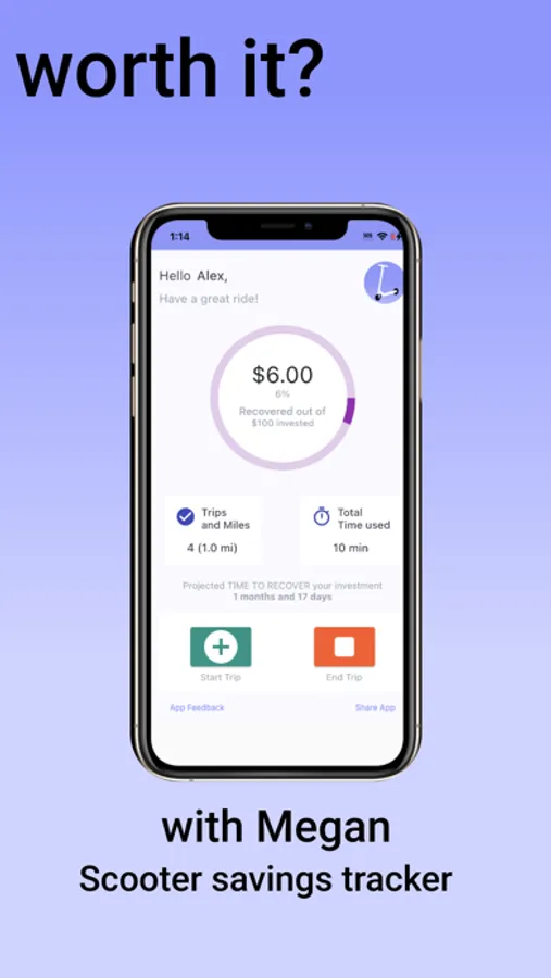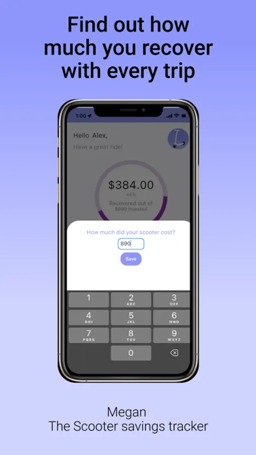 Megan is the scooter savings tracker that shows your real savings as you use your scooter, so you know when you will recover your initial investment