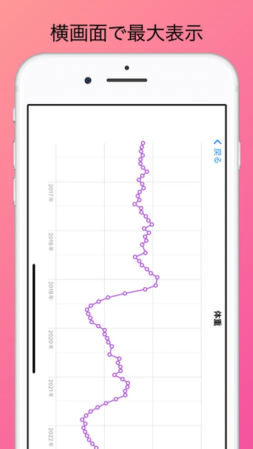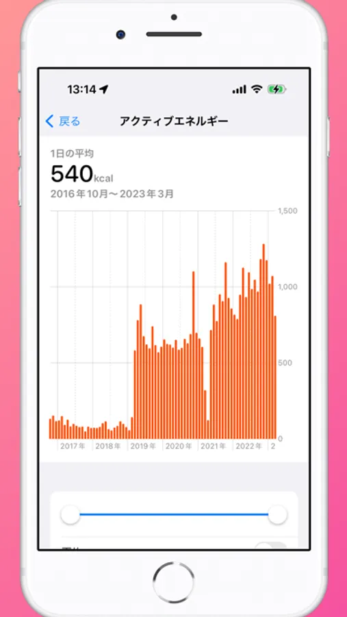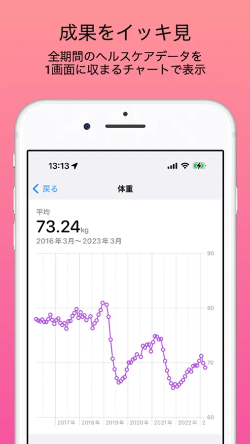 標準の「ヘルスケア」アプリでは1年分のデータしか一度に表示できませんが、1年を超えるヘルスケアのデータを1画面に収まるチャートで表示できます。サポートしているヘルスケアデータは、アクティブエネルギー、ウォーキング+ランニングの距離、エクササイズ時間、歩数、体重などの一部のみです。このアプリは「ヘルスケア」アプリにデータを登録している人向けのアプリです。