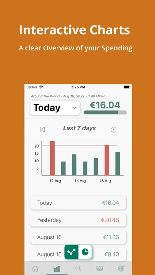 Whichever overview you prefer, you can view your expenses by category, traveller, country, currency or general listing. Clear charts help you keep track of your budget on a daily, weekly, monthly and even yearly basis.
