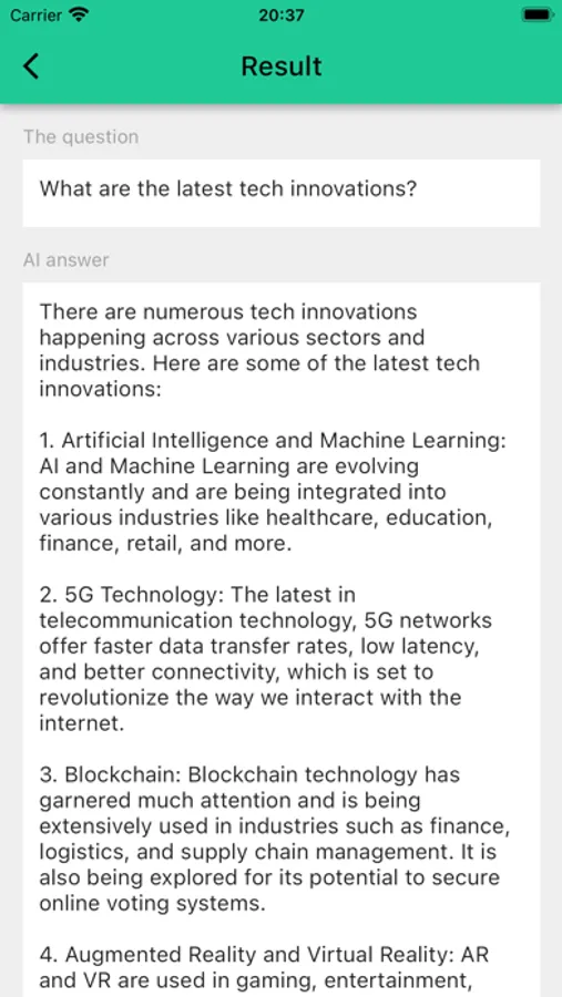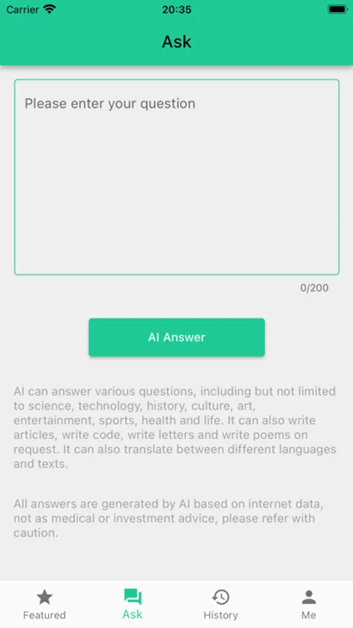 AI Answer is your personal intelligent question answering bot. Powered by advanced AI technology from ChatGPT and GPT-4 API, it can answer various questions on science, history, culture, entertainment, lifestyle and more. Get answers and learn interesting knowledge from AI Answer anytime and anywhere!