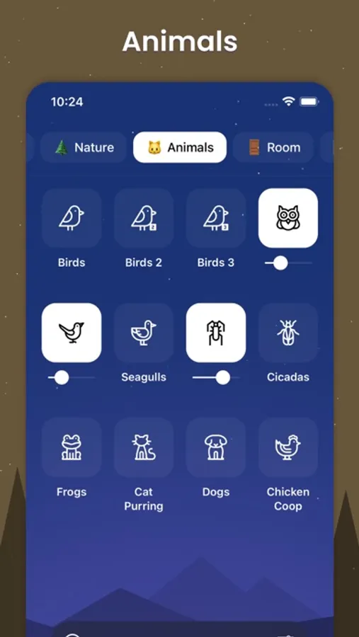 - animal sounds (birds, owls, cat purrs, crickets, frogs)