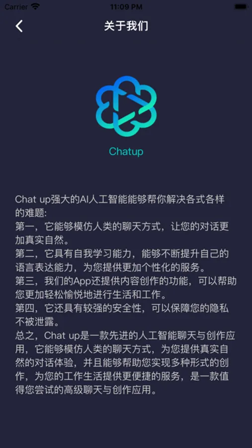 总之,Chat up是一款先进的人工智能聊天与创作应用,它能够模仿人类的聊天方式,为您提供真实自然的对话体验,并且能够帮助您实现多种形式的创作,为您的工作生活提供更便捷的服务,是一款值得您尝试的高级聊天与创作应用。