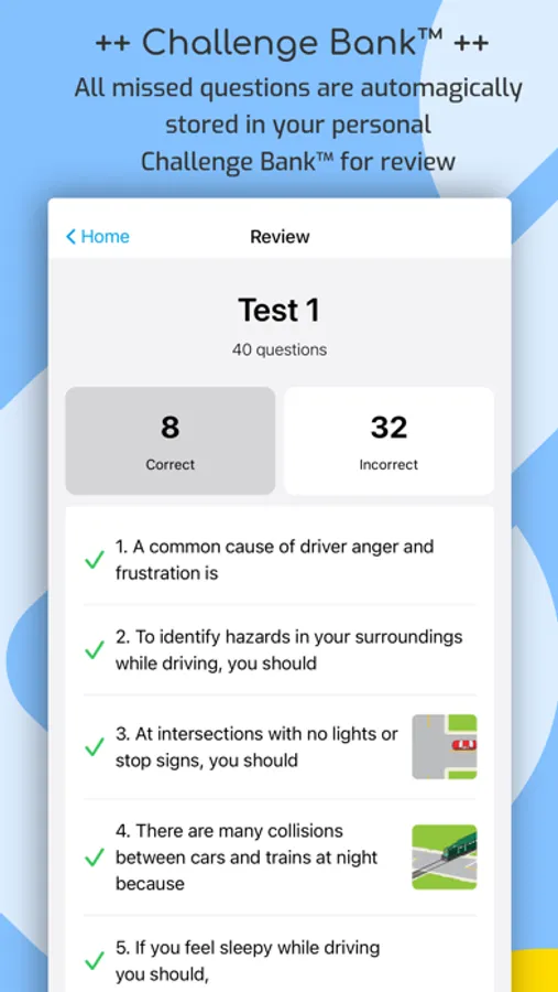 All missed questions are automagically stored in your personal Challenge Bank™ for review, so you'll know where to focus your study time.