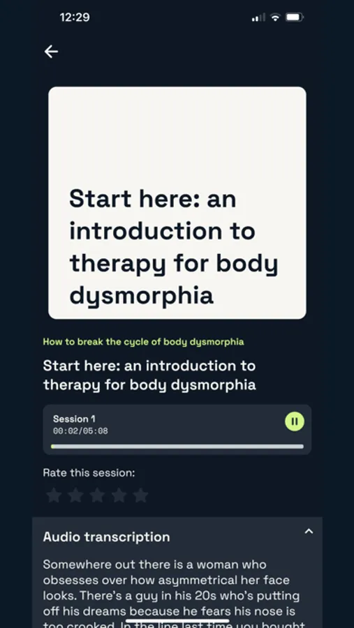 Listen now to our audio guide that teaches everything you'd learn from a BDD therapist: a mix of cognitive behavioral therapy (CBT) and acceptance and commitment therapy (ACT).