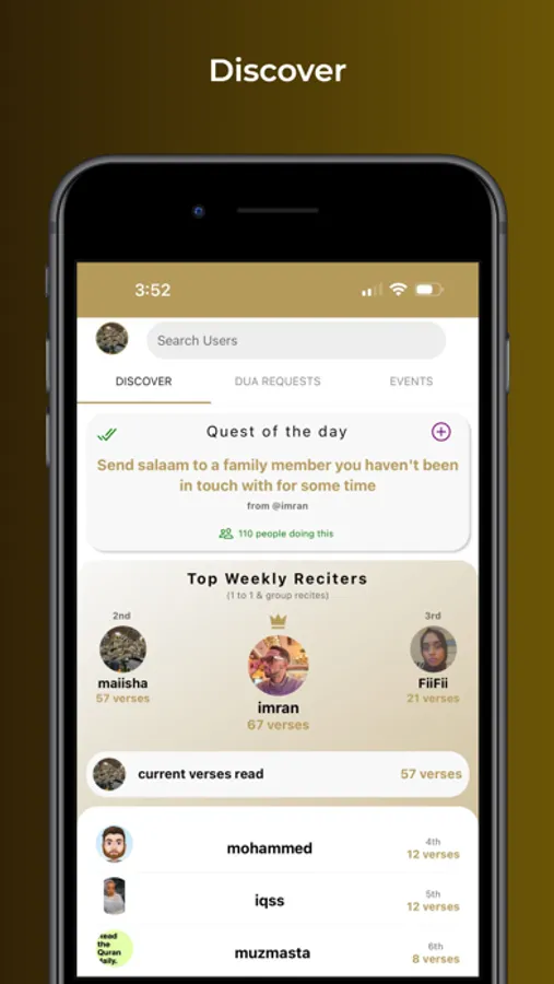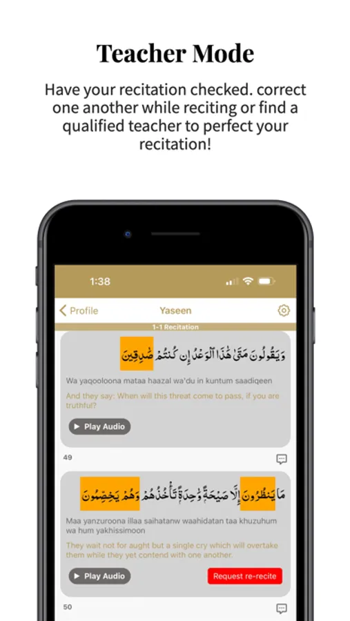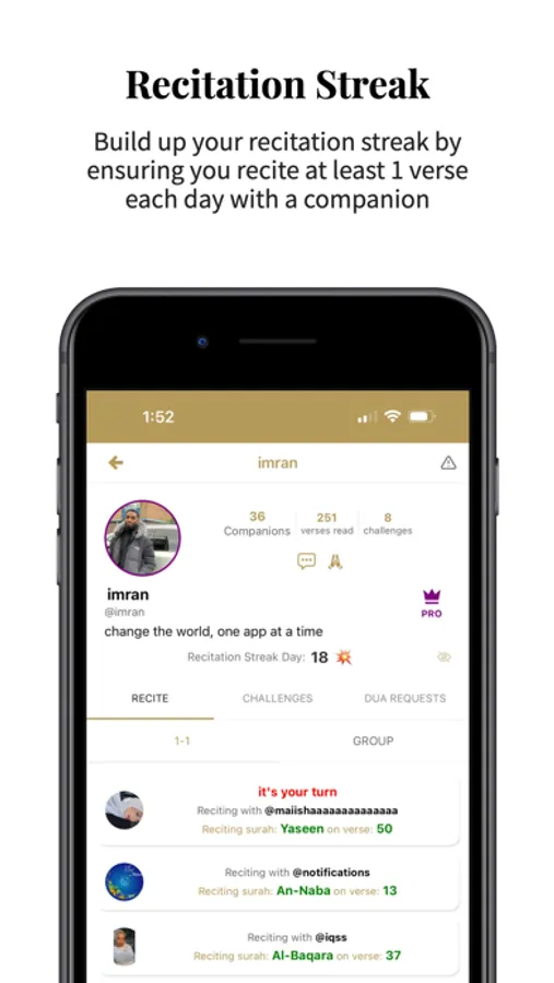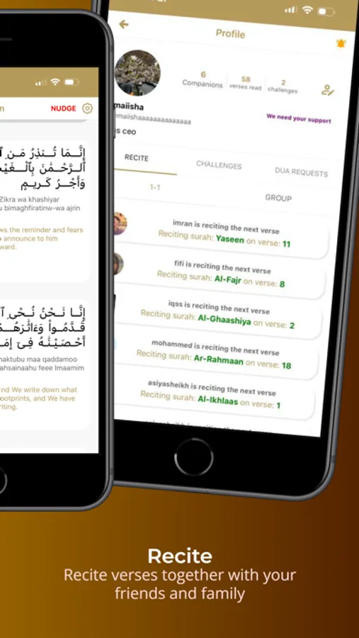 One unique feature of our app is the recite function, which allows you to recite Quranic verses with your friends or family members, one ayah at a time. This can be a powerful way to deepen your understanding of the Quran and build connections with others in your community.