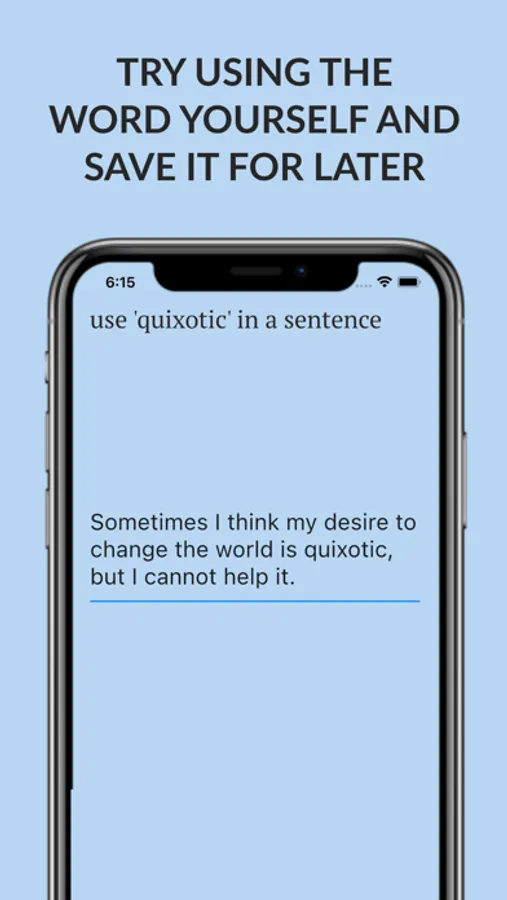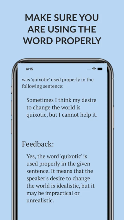 Dive deeper into the world of words with our unique "Try it Yourself" feature. Craft sentences using the new word and receive instantaneous feedback from our AI, ensuring not just learning but mastering the daily vocab. This interactive feature promises to enhance vocab understanding and usage accuracy, providing an unparalleled learning experience.