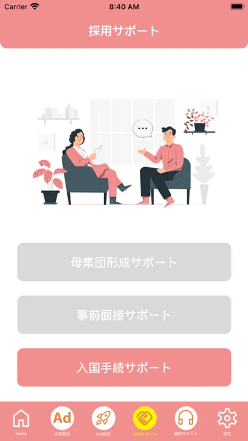 人材のスカウト内定後、実際に日本国内への入国・滞在のためのビザやその他資格の取得・申請手続きに関しても、入国サポートメニューを準備。