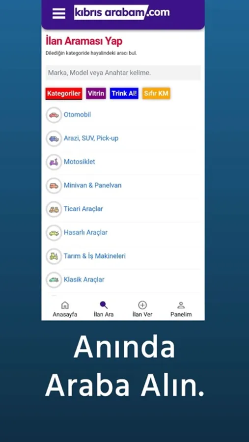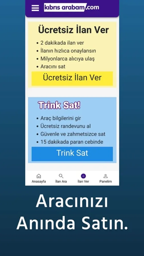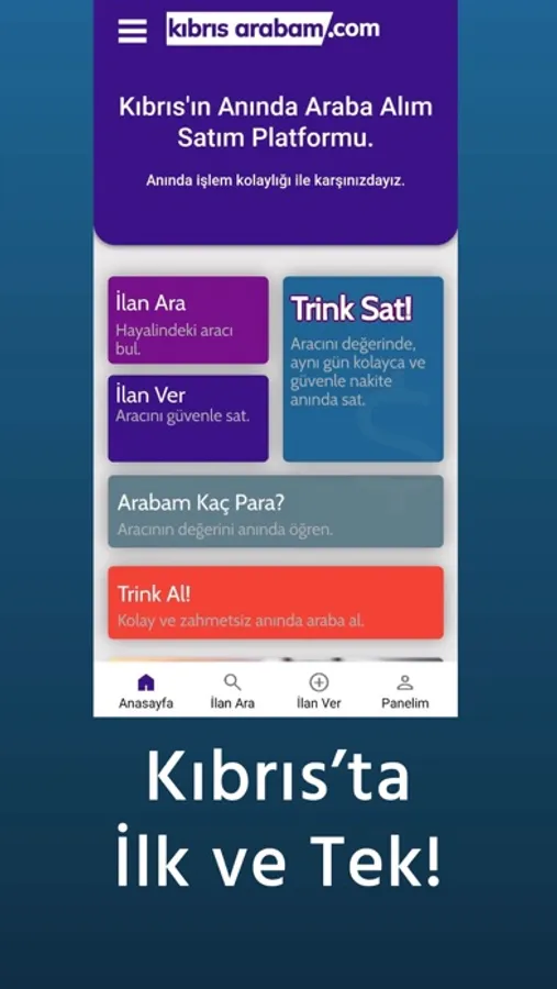 Kıbrıs Arabam uygulaması ile uygun fiyatlara hayalinizdeki arabayı alabilir veya aracınızı satmak istiyorsanız anında araç satın alma sistemimiz ile arabanızı bize anında satabilirsiniz. Arabanızın değerini belirleyen ve otomatik teklif oluşturan sistemimiz ile verilen fiyatı gün içerisinde değerlendirebilirsiniz.
