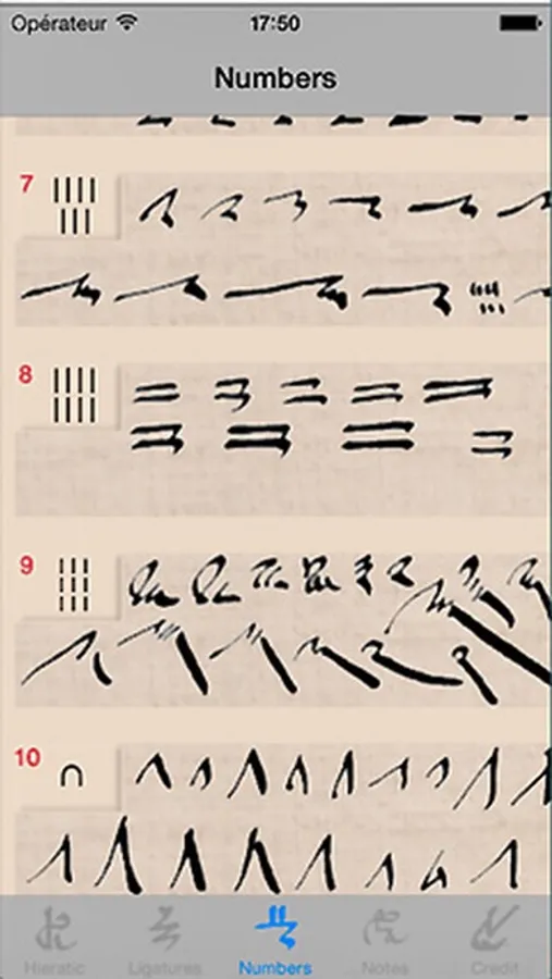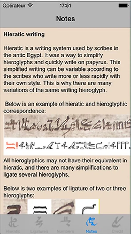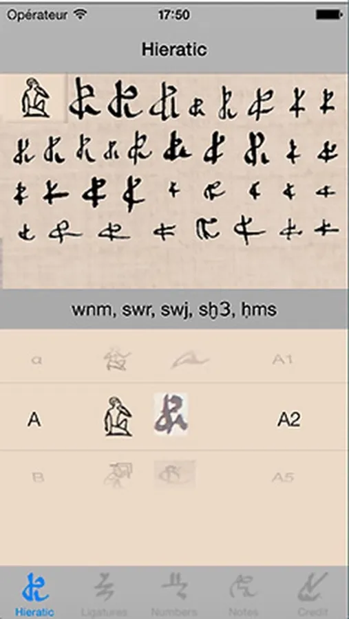 This application aims to show the correspondence between hieroglyphs carved on Egyptian monuments and fast writing on papyrus by scribes.