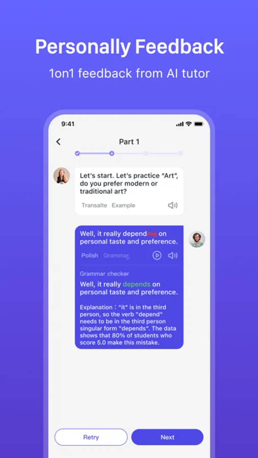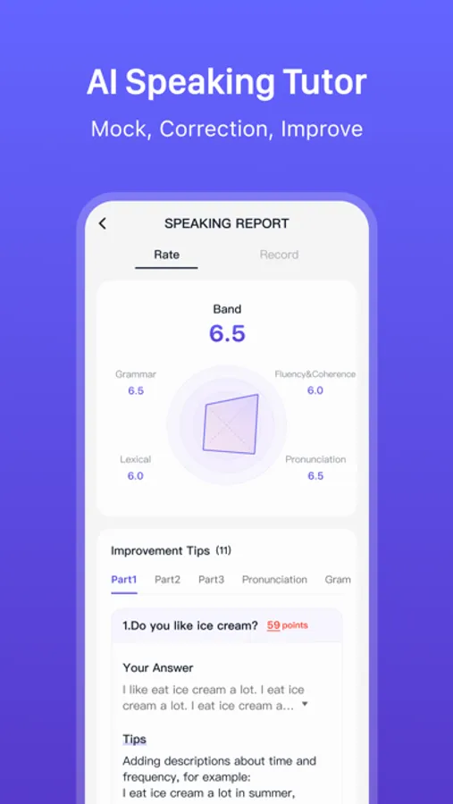1. Smart speaking practice: Predict small-scale exam topics, personalized feedback and tips covering grammar and idiomatic expressions.