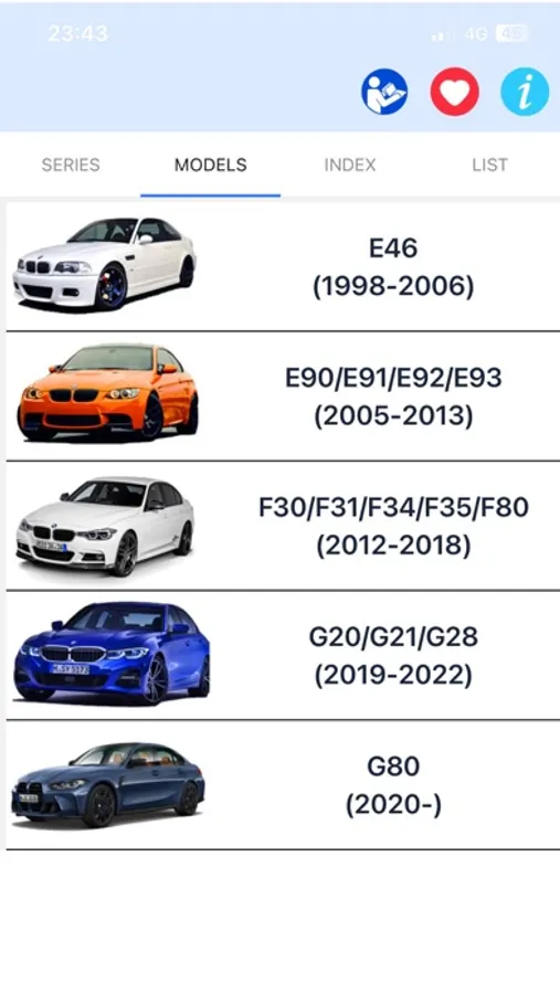 This application contains all electrical wiring diagrams and location of electronic components (ECU, Fuse Box..) for BMW cars from 1998 to 2023.