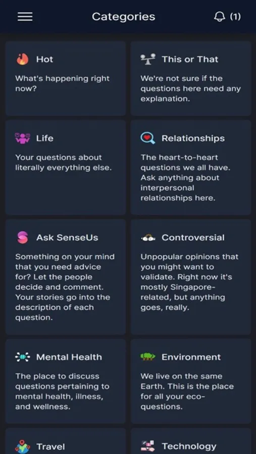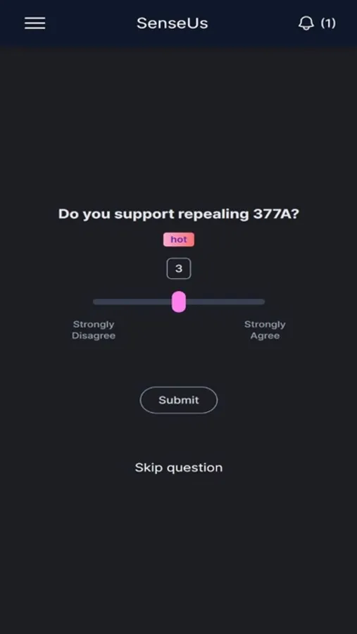 Ever wondered how others feel about a particular issue, but not sure where and how to ask? SenseUs gives you the power to do so. We're all about asking sensitive and sensible questions that matter. Through our curated list of topics, we strive to let you see how similar and different your views may be with the people around you. Ask, answer, and discover - take that step towards a better sense of the world around us.