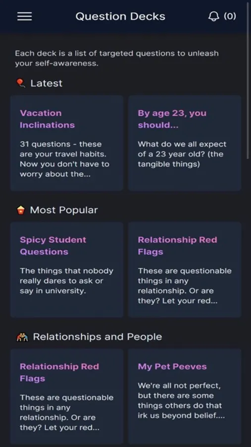 - Question Decks - this is a big one. Your attachment style, pet peeves, darkest secrets... these are targeted question decks that cater to a specific niche, and you can match these decks with your friends. Fun!! Do note that all questions in question decks have to be completed before matching.