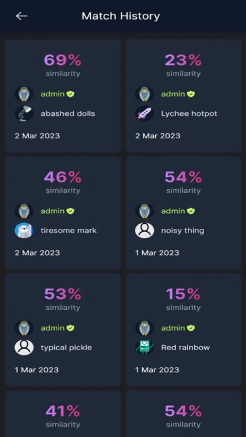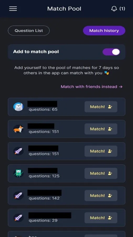 - Matching - the fun part. After answering all those spicy questions, you can match your answers with strangers in the match pool or your friends through your match code. A match report will be generated for the both of you, and you can start discussing away!