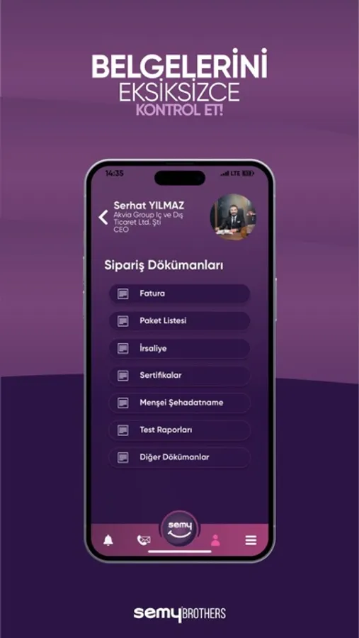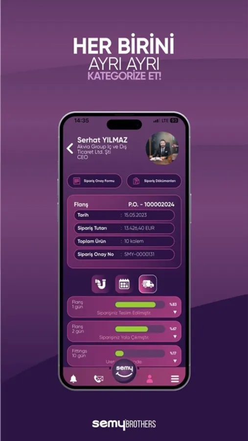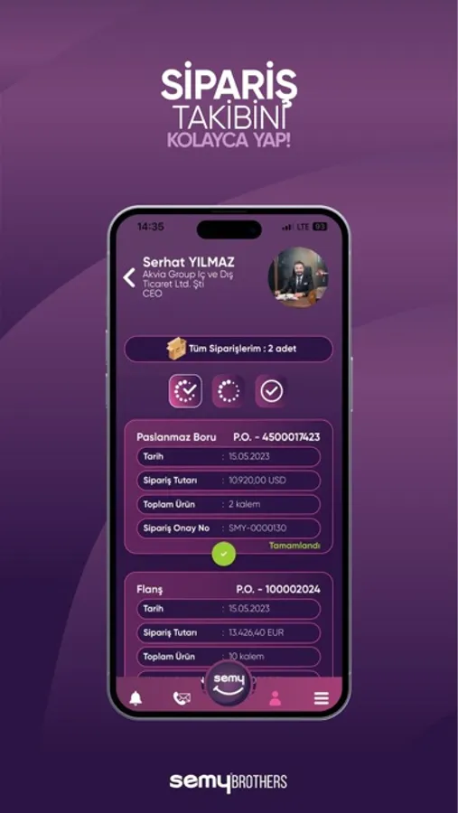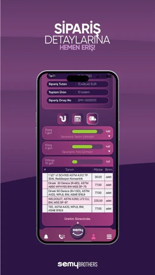 Semy Brothers firmasından geçtiğiniz siparişlerinizi takip edebilir, siparişleriniz ile ilgili dokümanlara anında ulaşabilirsiniz. Semy uygulaması sizlerin yerine siparişlerinizi takip eder ve siparişleriniz hakkında güncel bildirimlerde bulunur. Bunun yanı sıra firma yetkililerimizle hızlı bir şekilde iletişim kurarak, teknik bilgi talebinde bulunabilir, talepleriniz konusunda soru sorabilir ve ilgili her konuda haftanın 7 günü ve günün her saatinde kendilerine danışabilirsiniz.