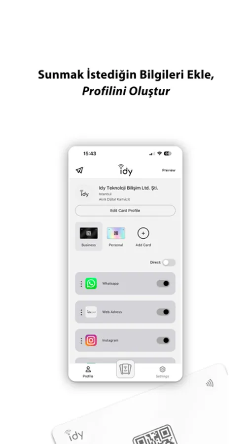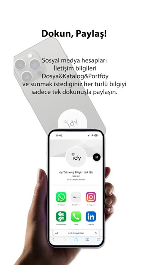 Idycard, NFC teknolojisine sahip akıllı bir dijital kartvizittir, akıllı Idycard’ınızı karşı tarafın telefonuna yaklaştırarak iletişim bilgileriniz, sosyal medya hesaplarınız, ödeme yöntemleriniz, müzik ve istediğiniz tüm bilgilerinizi anında paylaşabilirsiniz.