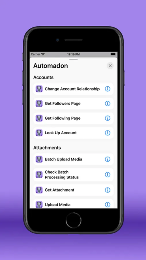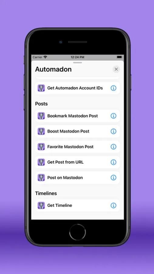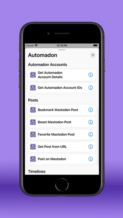 Automadon provides a suite of Shortcuts actions for Mastodon with support for multiple accounts. Actions available within Shortcuts include: