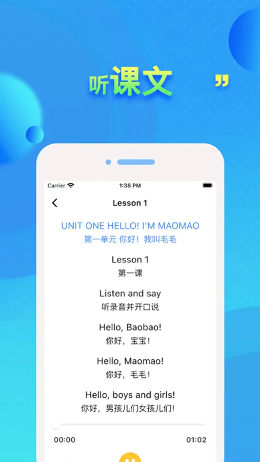 同步课本各单元听力,音频。与单纯音频播放不同,增加语速调整,中英文对照,播放进度控制声音播放与文本同步。